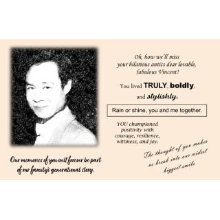 Vince is survived by his mother, Iluminada (Luming or Ada) Laurel Soto, predeceased by his father, Pantaleon ‘Loy’ Soto, siblings Nick (Noemi), Dette Pervez (Shahid +), Zizi (Chona), Aunt Zonie and Uncle Paeng, also cousins who adore his quick-wittedness and vibrant spirit, nieces and nephews, and grand nephews.